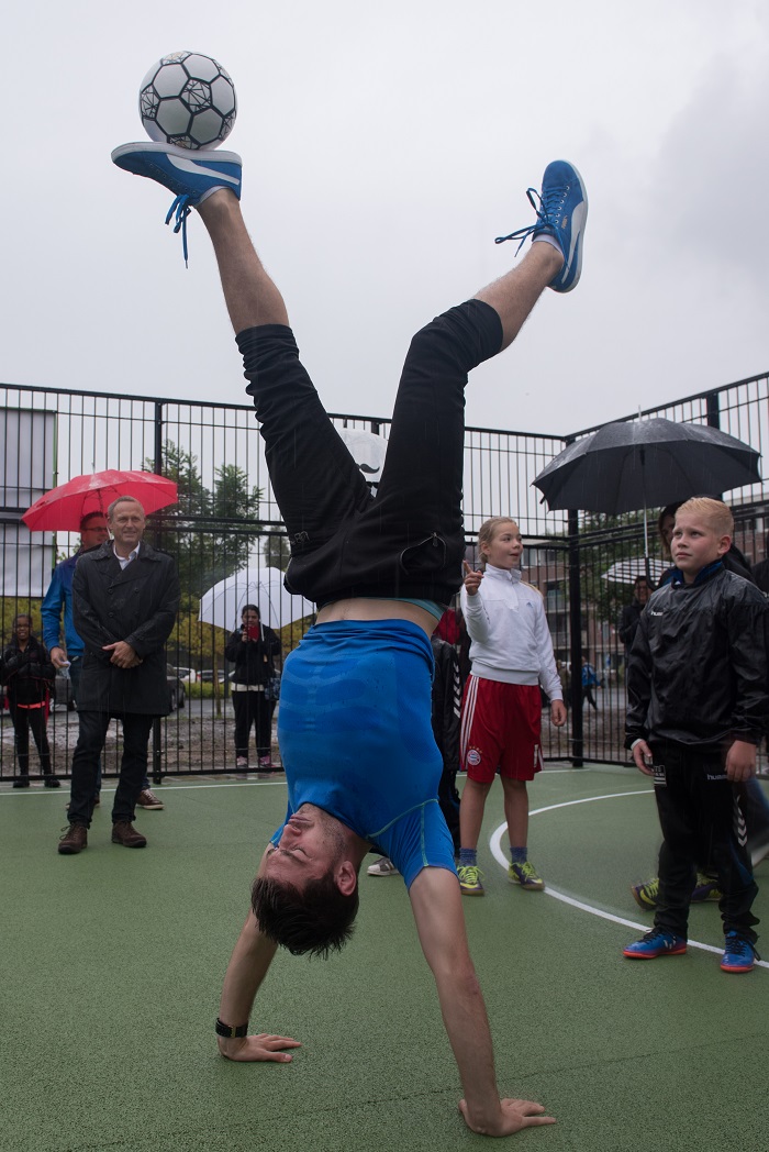 Een slordige 43.000 euro wordt beschikbaar gesteld voor het Sportplein. De eerste horde is genomen, hoewel het bedrag nog niet genoeg is om alle plannen waar te maken. “Maar”, zegt Ravor, “met zo’n bedrag op zak is het toch makkelijker om sponsoren te werven”. Het kleine idee krijgt een steeds grotere omvang. Uiteindelijk loopt de teller op tot 150.000 euro. De basis van het Sportplein is een veerkrachtige en waterdoorlatende betonvloer van Stedon. De oude plak asfalt wordt uitgehakt en vervangen door de nieuwe vloer, waarvan de onderste laag bestaat uit korrels die hemelwater als een spons opzuigen. Plassen zijn vanaf dat moment verleden tijd.