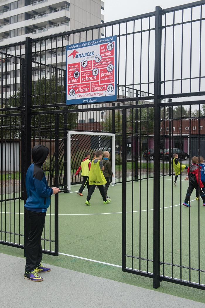 Bovendien is de vloer geluiddempend, juist om de oudere bewoners van de aangrenzende flats te ontzien. “Het kostte veel moeite om de gemeente te overtuigen van deze vloer, maar uiteindelijk is het gelukt”, zegt Ravor. De betonvloer, officieel erkend door NOC*NSF, is de ondergrond van een basketbalveld die tevens voldoet aan de eisen voor rolstoelbasketbal, een voetbalkooi en meerdere tafeltennistafels. Een sportclub zou er nog jaloers op worden. Het Sportplein is nu, zo vlak na de opening eind september, nog een kale bedoening, maar volgens Ravor komt daar rap verandering in. Bankjes worden nog geplaatst, bosschage nog aangeplant. “Juist voor de oudere flatbewoners. Zij willen ook naar buiten en kunnen dan even lekker zitten. Het Sportplein is een ontmoetingsplek.”