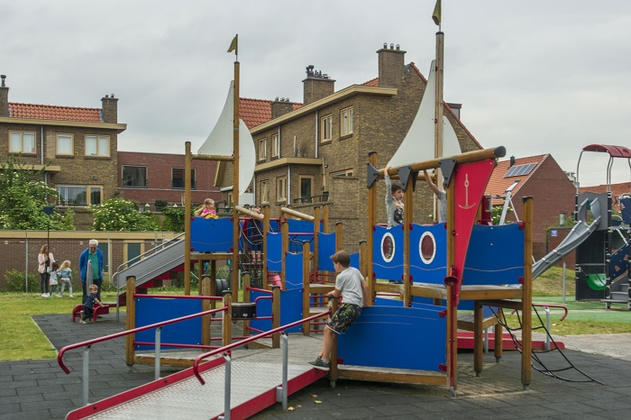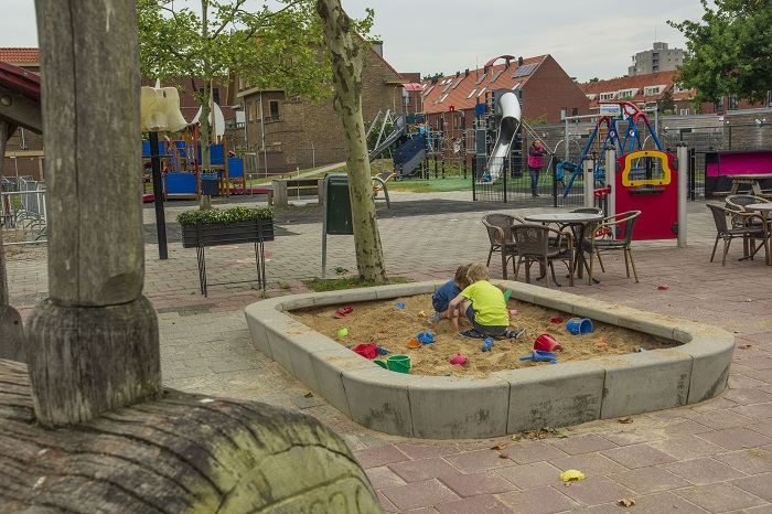 Op nog een reden kun je Zuiderkwartier een klassieke speeltuin noemen. In de basis draait het in de speeltuin om speeltoestellen. Aan één zijde van het centrale terras is een speciale plek voor peuters en kleuters, aan de andere zijde kunnen de oudere kinderen naar hartenlust spelen op kleine en grote speeltoestellen. Als ontwerper valt op dat toestellen van verschillende leveranciers zijn, verschillende leeftijden, verschillende materialen en verschillende ondergronden. De ontwikkeling van speelruimte als ‘landschap’ met prikkels en aanleidingen heeft hier nog geen intrede gedaan. En ‘groene speelruimte’, daar heeft Ineke een uitgesproken mening over. En terecht. Dat zijn nou juist zaken waar het primair niet om gaat in een speelruimte als deze. Het gaat om de uitdaging en afwisseling die de speeltuin de kinderen te bieden heeft. En die is volop aanwezig!