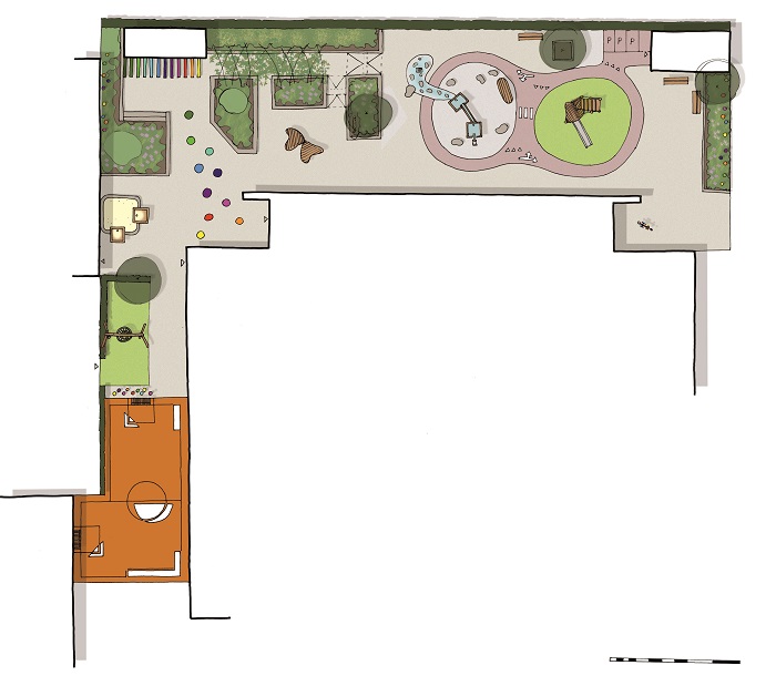 Wie het plein nu bezoekt, ziet bij de entree van het gebouw zitbankjes staan, neergezet voor kinderen die de overgang van binnen naar buiten heftig vinden en even tot rust willen komen. Paden zijn extra breed aangelegd, om het plein fysiek toegankelijk te maken voor iedereen. Er is een grote bank om even lekker te zitten, maar diezelfde bank kan ook dienstdoen als tribune. Er is ook een zand- en waterspeelplek die op verschillende niveaus toegankelijk is, zodat lopende leerlingen en kinderen in een rolstoel hier samen kunnen spelen. Bij de bestaande zandbak zijn daartoe twee zandtafels op hoogte geplaatst en je kunt naar een watertafel rijden om met water te spelen.