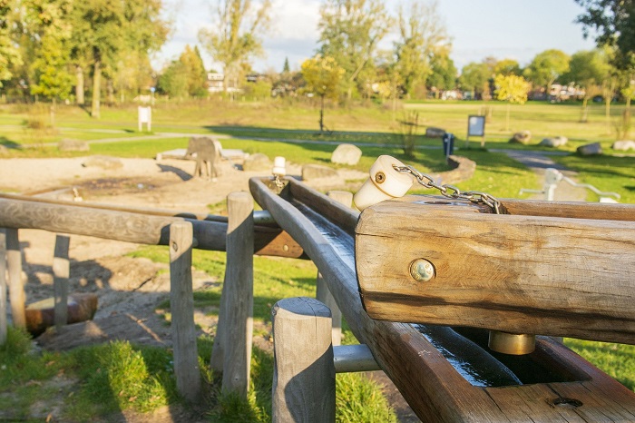 Goed te zien is dat dit afgelopen tijd heeft geleid tot erosie van grond waardoor een hele gleuf in de heuvel is gesleten. Door een steen onder de laatste goot te plaatsen, wordt verder uitslijten voor een groot deel beperkt. Helaas is voor deze watergoten de speelwaarde beperkt tot een vaste volgorde van goten en de stop aan het einde van iedere goot. Hier had mogelijk meer ingezeten door meerdere stroomgangen in de goten toe te passen. Bij een tweede waterpomp komt het water terecht in watertafels. Net als de eerste pomp staat ook deze in de verharding waardoor kinderen in rolstoel gemakkelijk kunnen aanschuiven en in de watertafels met water en zand kunnen spelen. Ook hier de kanttekening dat er weinig variatie zit in de spelmogelijkheden die in en aan de watertafels geboden wordt. Samenwerken voor water