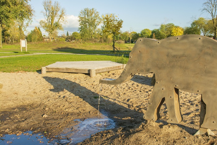 Als laatste de speciale pomp, in de vorm van een olifant. De staart lijkt de pomp te zijn, maar in dit geval is dat schijn. Toch zie je aan het zand dat de olifant uit zijn slurf water kan ‘spuiten’. En dat klopt ook, alleen daarvoor moet je niet bij deze ‘pomp’ zijn die in het zand staat, maar bij de pomp verderop in de verharding, waar onder de kraan geen watergoot of watertafel aanwezig is. Vandaag is Eelco hier zelf op onderzoek gegaan en leerde dat deze ‘vierde’ pomp niet loos is, maar dat juist deze pomp zorgt dat het water een paar meter verderop uit de olifant spuit. Een verrassing, althans; de kinderen wisten dat al, maar zij waren juist bij de pompen met watergoten aan het spelen.