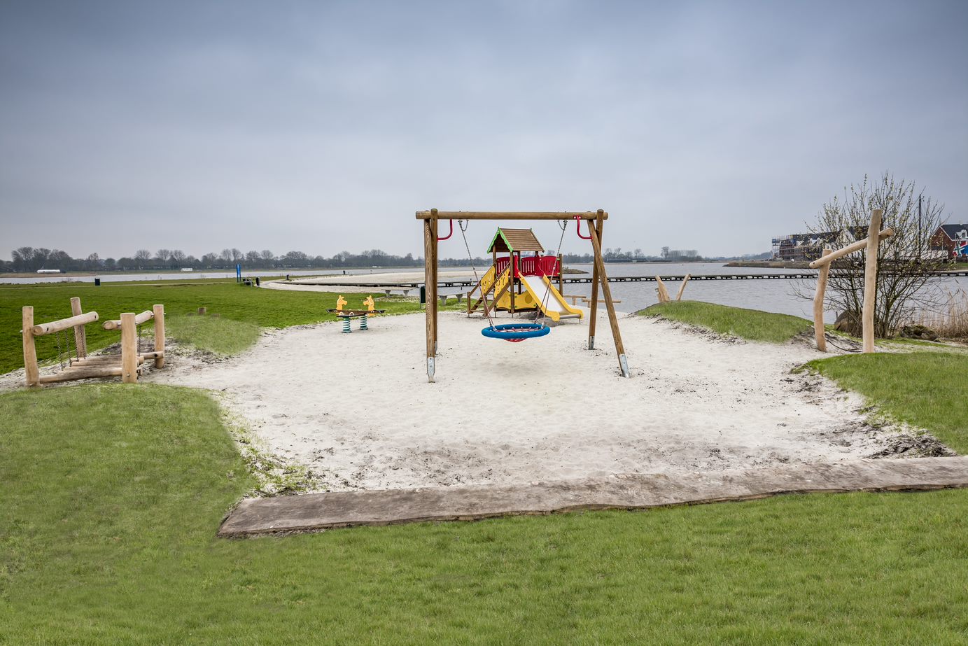 Tuin- en landschapsontwerper Monique Kuijstermans van BTL Advies is met de speelplaats aan de gang gegaan. “Gezien de waterrijke omgeving dacht ik al snel aan een schip”, vertelt ze. “Door middel van een aarden wal met gras hebben we de buitenlijnen van een schip nagebootst, waarin de speeltoestellen een plek hebben gekregen. Het verhaal gaat dat dit aangespoelde schip op het land in tweeën is gebroken. Daardoor wordt de plek nog geheimzinniger,” denkt ze. “Schepen zijn een gewild thema in speelland. En dit verhaal erachter spreekt kinderen aan. De schommel is nu het kraaiennest, de veerwip zijn de zeehonden en de glijbaan doet dienst als kajuit.” Over het ontwerp waren zij en Lage Venterink het snel eens met Perton. Om het thema extra kracht te geven zal nog een pomp worden geplaatst, waarmee kinderen water uit het scheepswrak in het meer kunnen oppompen.