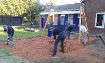 Samen met een twintigtal ouders van de kinderen werden de handen uit de mouwen gestoken om de speelplek te voorzien van de valdempende ondergrond Dekowood houtsnippers en speeltoestellen van Yalp aan te leggen.
