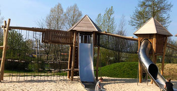 De klimtorens zijn met elkaar verbonden met behulp van aparte klimklauter verbindingen. De speeltorens zijn op diverse manieren te bereiken: via trapjes, klimwandjes of netconstructies. Boven aangekomen, kun je kiezen om via één van de glijbanen terug te gaan of om via een spannende oversteek naar het volgende gedeelte te klauteren. Netbruggen, een spannende wiebelende trapconstructie, het maakt het klimmen op hoogte tot een ware belevenis. En verder, op de heuvel prijkt een vernieuwde robuuste hardhouten trap die je naar de uitkijktoren brengt. De uitkijktoren is op deze manier onderdeel geworden van het geheel.